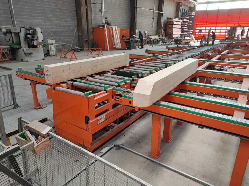 Tiesse ha automatizzato anche il processo produttivo, le travi vengono trasportate dalle rulliere e stoccate in parti diverse del magazzino in base alla tipologia di prodotto ottenuto